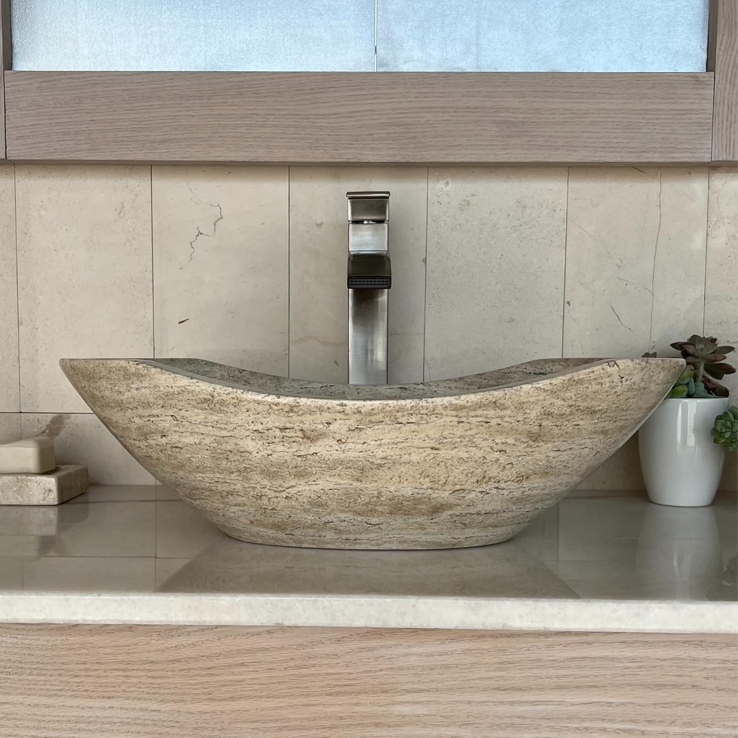 Elevate Your Bathroom: Unique Oval/Canoe-Shaped Vessel Sink Crafted from Natural Travertine Stone. Its Luxurious Design and Smooth, Shiny Polished Surface Offer Practical Elegance