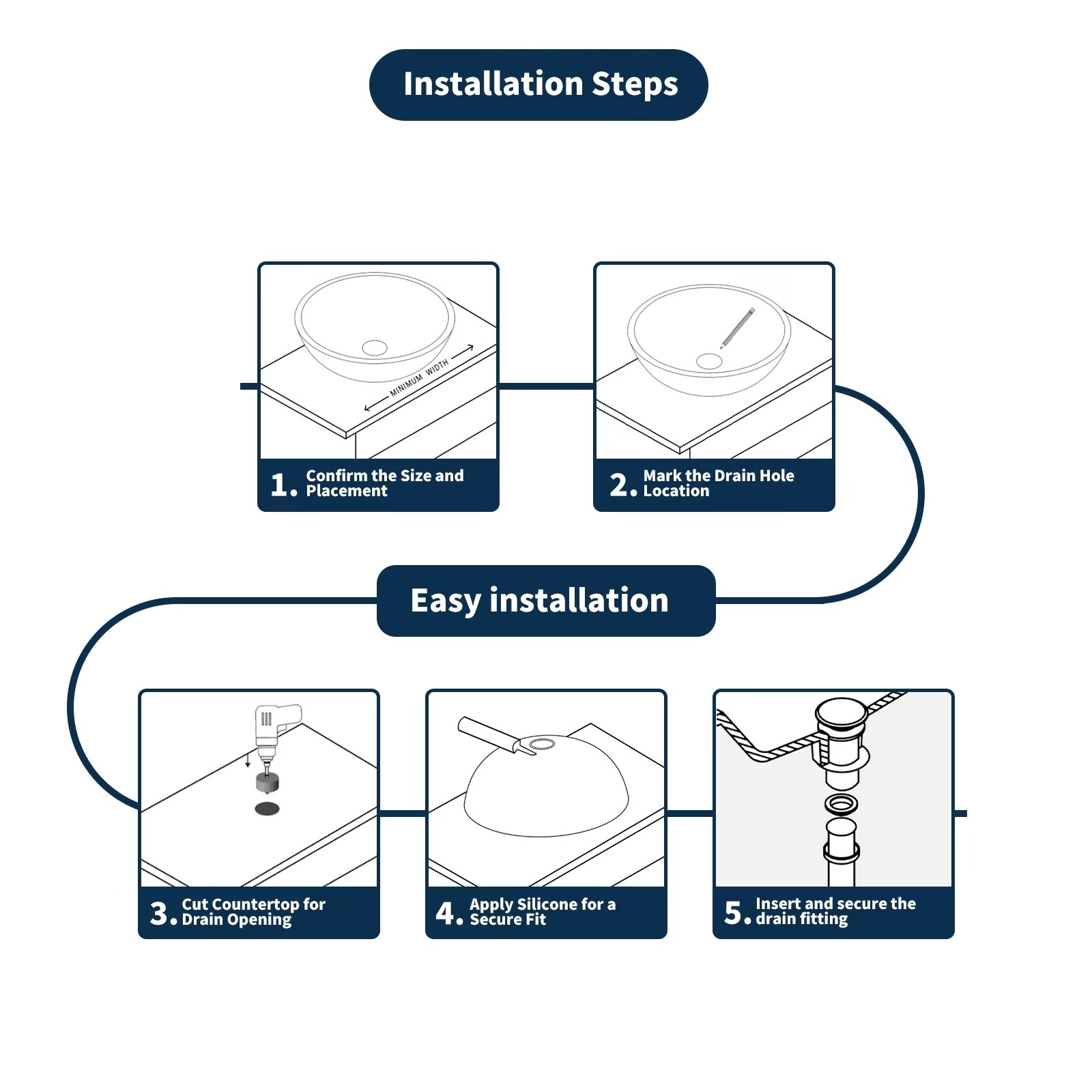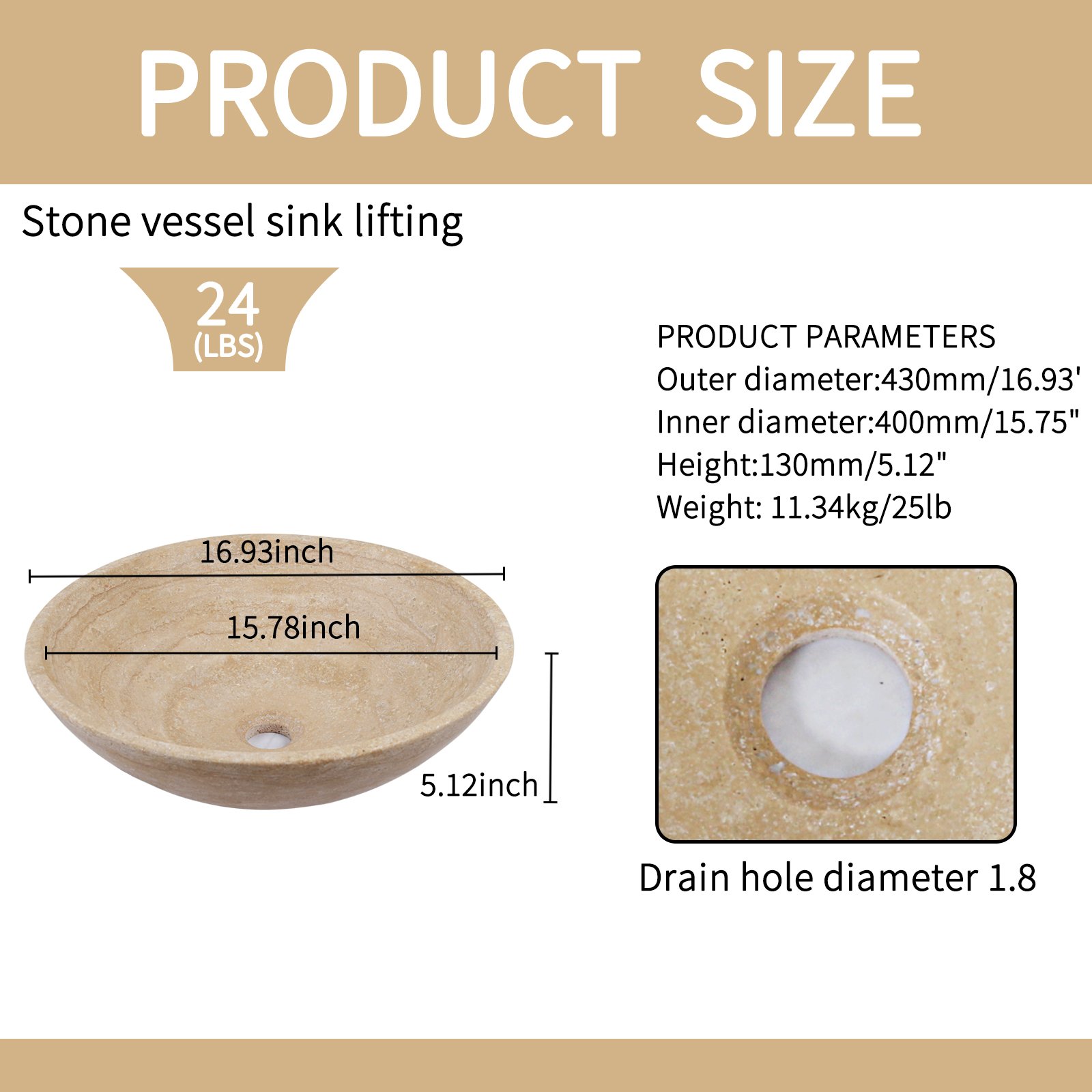 Designed to balance aesthetics and functionality, this vessel sink features dimensions of 16.93″ x 16.93″ x 5.1″ (W x D x H). The internal bowl depth of 4.3 inches ensures smoother water flow without any unwanted splashing. With a drain hole diameter of 1.77″, it is compatible with a wide range of standard plumbing fixtures, making installation effortless.