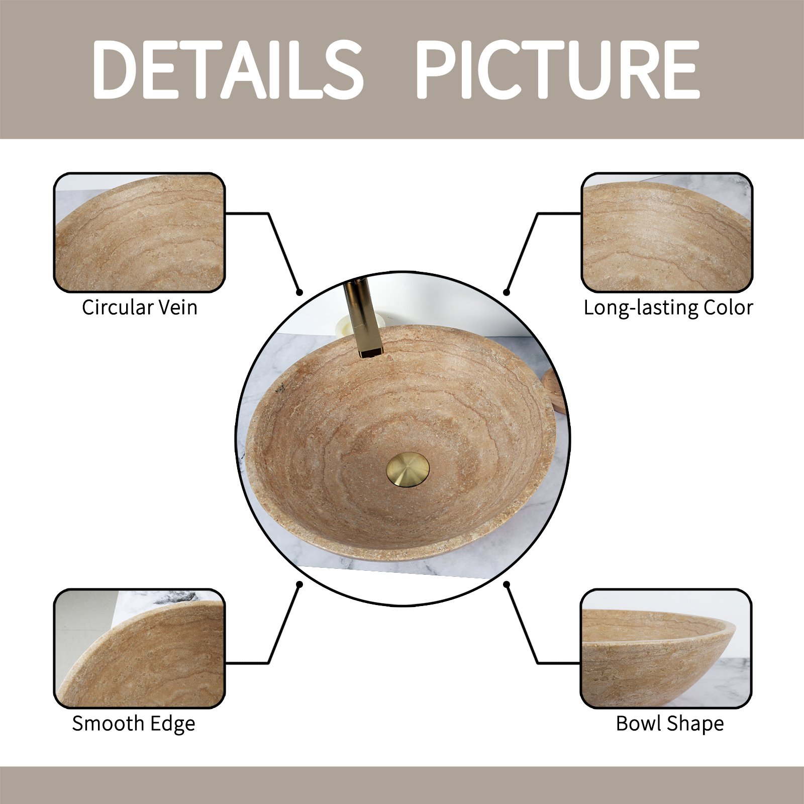 Experience the unparalleled beauty of natural travertine marble with our exquisite round marble vessel sink. Known for its unique pitted or ridged surface texture, this beige marble showcases stunning natural color variations and calcified holes, making every piece a genuine work of art. The surface is left unfilled to retain the authentic charm of travertine stone, ensuring each sink has its own distinctive character.
