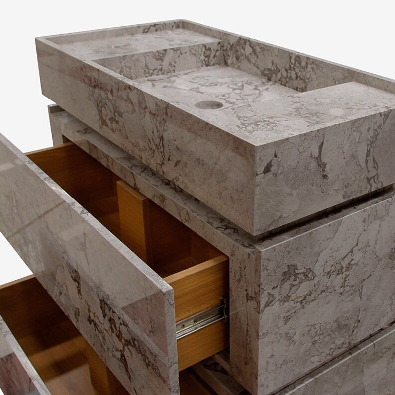 A: Interior layout may include drawers, shelves, or a combination — optimized for toiletries, towels, and bathroom essentials.