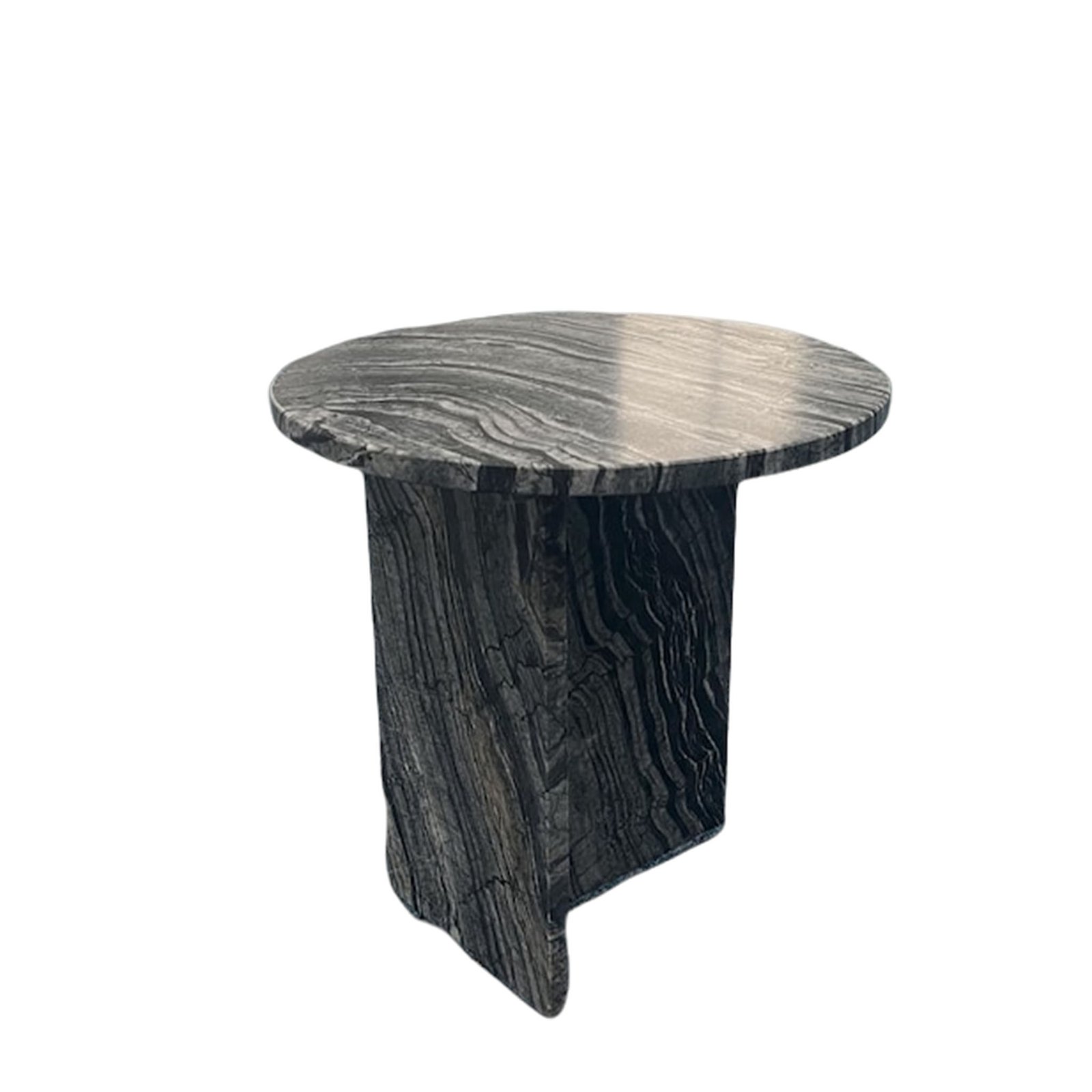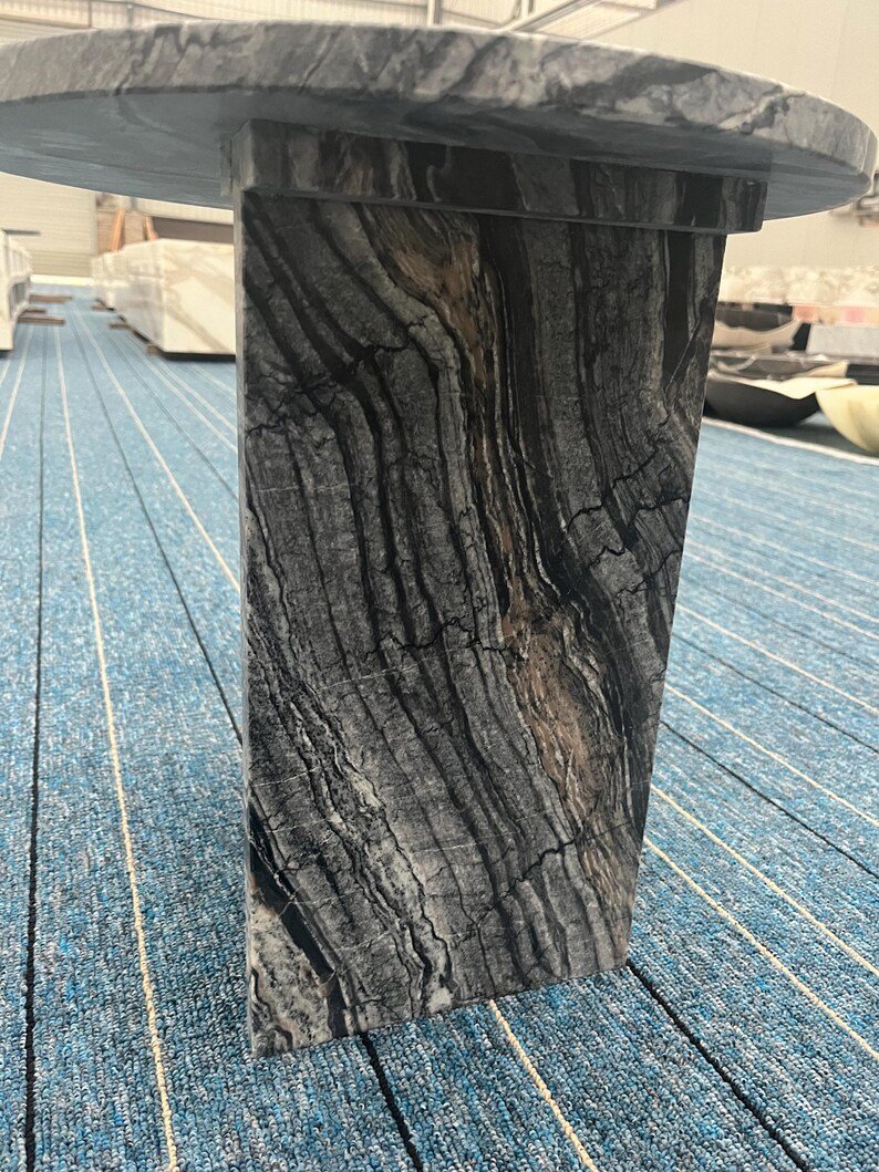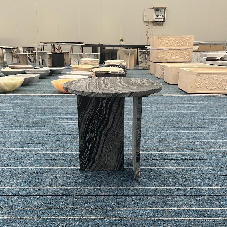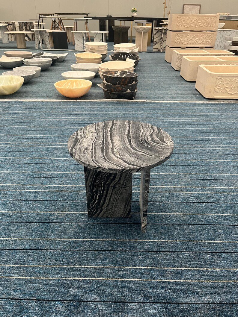 A: The Moonstand I is crafted from solid natural stone — either as a monolithic block or with matching stone top and base.